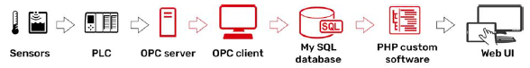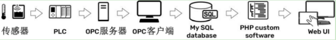 • 最后他们找了前端工程师,使用PHP一种基于服务器的脚本语言,来开发性的网页界面。他们的整个系统架构作为IIoT工业物联网,显示于下图。虽然复杂且成本较高,但是系统也工作了。自动化工程师和IT人员最终完成了这个任务,但是他们希望能够有更简单,低成本的解决方案。