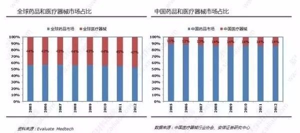 但是,我国是人口大国,每年临床所需的医用植入体依然大都来自美国和欧洲发达国家,从医疗器械市场规模与药品市场规模的对比来看,2012年全球医疗器械市场规模大致为全球药品市场规模的47%,而我国这一比例仅为14%。我国出口产品主要以医用耗材、按摩器具、常规设备等中小型、低技术含量、低附加值产品为主。