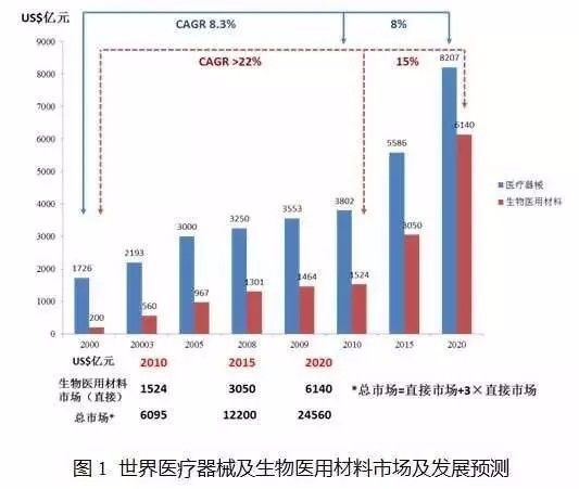 据统计,生物医用材料在2000-2010年全球市场复合增长率(CAGR)高达22%以上,2010年全球市场达US20亿元,预计2009-2020年市场CAGR可保持15%左右,2015年世界市场可达US50余亿元,2020年达US40余亿元,与此同时带动相关产业(不含医疗)新增产值约3倍,2015年和2020年直接和间接销售总额分别可达4×US50亿元≈US200余亿元,和US560余亿元。