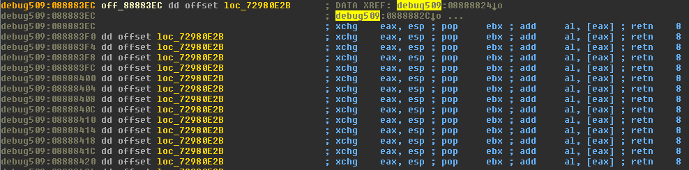 下一个ROP gadget会使用这个VirtualProtect指针来调用VirtualProtect(0x8888C90, 0×201, 0×40, 0x72A4C045)函数。执行这个操作后,程序控制权会移交给0x8888F70地址处的shellcode,这段shellcode会解密并执行内嵌的DLL: