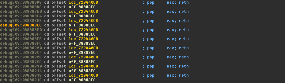 ROP的第二部分内容会被忽略掉,其作用是将EIP寄存器设置为0x088883EC。最后的“pop eax; retn”指令会将0x729410D0地址填充到EAX中。这个地址是msvbvm60.dll导入(Imports)表中VirtualProtect指针所对应的地址(VirtualProtect位于Kernel32.dll中)。