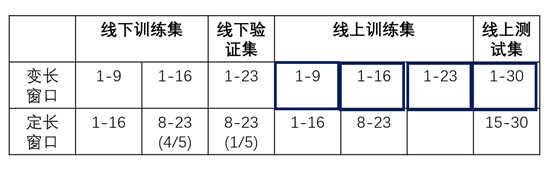 同样的道理,所以最终我们构造出了两个可行的窗口,如表一所示,第一个是变长窗口,线下训练集是1-9,1-16,线下验证集是1-23。线上训练集是1-9,1-16,1-23,线上测试集就是1-30。另一个是定长窗口,线下训练集是1-16,8-23(4/5),验证集是8-23(1/5),线上训练集是1-16,8-23,线上测试集是15-30。