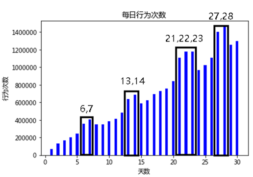 如图三所示,我们发现每天的行为次数从第一天开始每隔五天就会有两天突增,我们猜测这两天应该是周末,说明有个用户群在周末这两天比较活跃,而在周内相对活跃次数较少。这部分用户也许是上班族等,他们得生活规律有周期性。21,22,23这三天也比较多我们猜测是节假日三天。