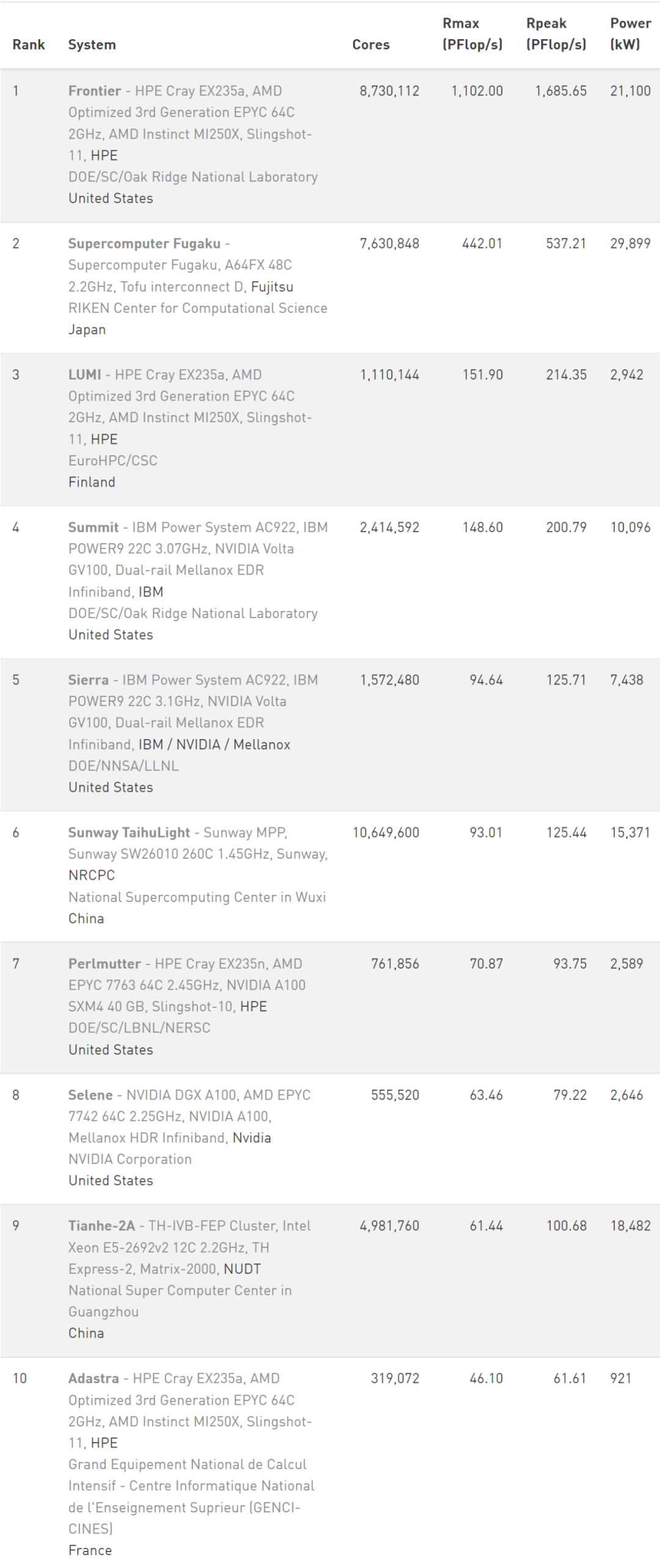 美国的 Frontier、芬兰的 LUMI 和 法国的 Adastra