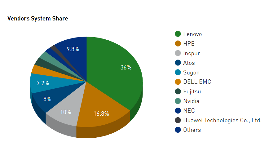 联想是 Top500 榜单上的常客,其参与基准测试的新系统数量最多(17 个),在 14 个新系统中,HPE 的数量位居第二(其中 7 个采用 AMD+AMD 节点,通过 Slingshot-11 连接,包括 三个 NNSA/LLNL 系统)。在所有 500 个系统中,按纯系统数量计算的阵容是联想(180 个)、HPE(84 个)和浪潮(50 个)。按性能份额比较的话,排名依次为:HPE(18.6%)、富士通(18.1%)和联想(15.1%)。