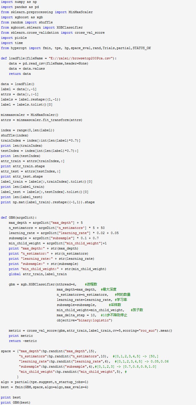 xgboost具有很多的参数,把xgboost的代码写成一个函数,然后传入fmin中进行参数优化,将交叉验证的auc作为优化目标。auc越大越好,由于fmin是求最小值,因此求-auc的最小值。所用的数据集是202列的数据集,第一列样本id,最后一列是label,中间200列是属性。