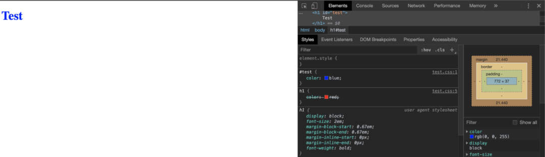 对于应用于元素的每个 CSS,你都可以轻松确定哪种样式将生效。例如,如果你加载上面的 HTML 代码: