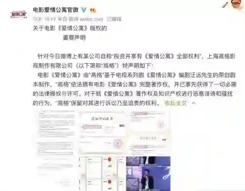 随后,电影爱情公寓官微发布声明回应称,电影《爱情公寓》由上海高格影视制作有限公司(以下简称“高格”)基于电视系列剧《爱情公寓》编剧汪远先生的原创剧本制作,“高格”依法拥有电影《爱情公寓》完整著作权,并已事先获得了一切必需的法律授权与许可。对于就《爱情公寓》著作权及知识产权进行恶意诽谤和骚扰的行为,“高格”保留对其进行诉讼乃至追责的权利。