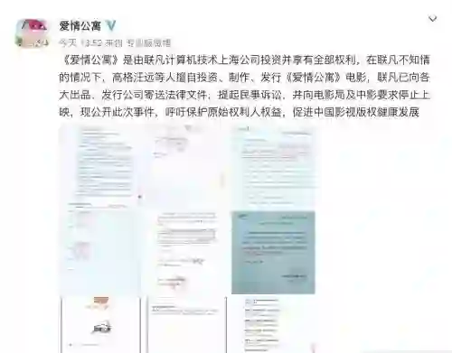 今日,微博认证为“上海尚庆网络科技有限公司”的蓝V@爱情公寓发文称,《爱情公寓》是由联凡计算机技术上海公司投资并享有全部权利,在联凡不知情的情况下,高格汪远等人擅自投资、制作、发行《爱情公寓》电影,联凡已向各大出品、发行公司寄送法律文件,提起民事诉讼,并向电影局及中影要求停止上映。