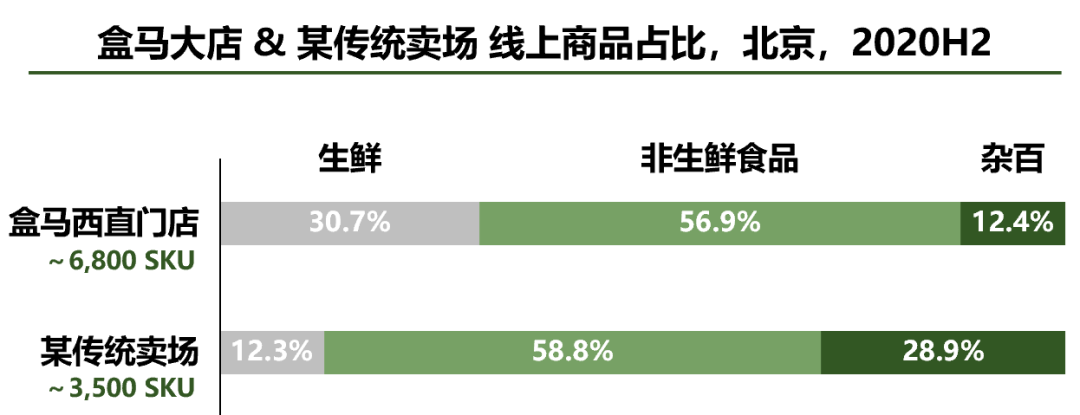 图9:盒马大店VS传统卖场,线上SKU占比,2020H2