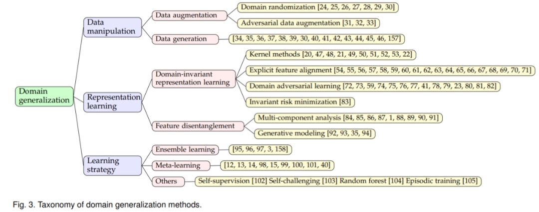 领域泛化方法是我们的核心。我们将已有的领域泛化方法按照数据操作、表征学习、学习策略分为三大方面,如下图所示。
