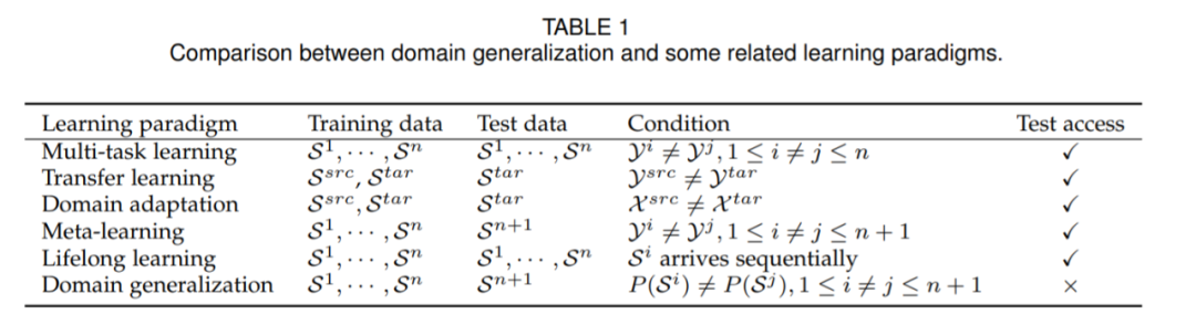 DG 不仅与 DA 问题有相似之处,其与多任务学习、迁移学习、元学习、终身学习等,都有一些类似和差异之处。我们在下表中对它们的差异进行了总结。