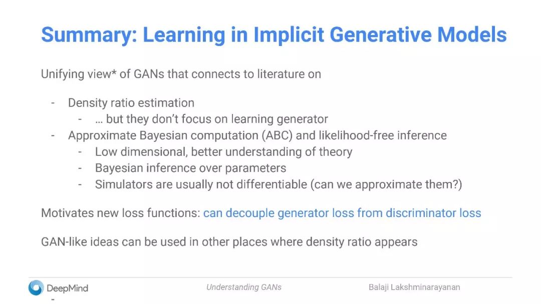 【新智元导读】本文是DeepMind高级研究科学家Balaji Lakshminarayanan在SF AI Meetup上演讲的slides,总结了他以及 Ian Goodfellow,Shakir Mohamed, Mihaela Rosca等人最新的GAN工作。
