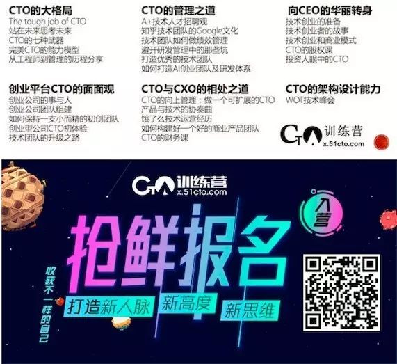CTO训练营,为51CTO旗下面向中高端技术管理者的学习和社交平台,邀请一线互联网公司的CEO、CTO以及知名投资人做客,为从业10年以上的技术管理者提供企业战略、企业运营、团队管理等内容分享。