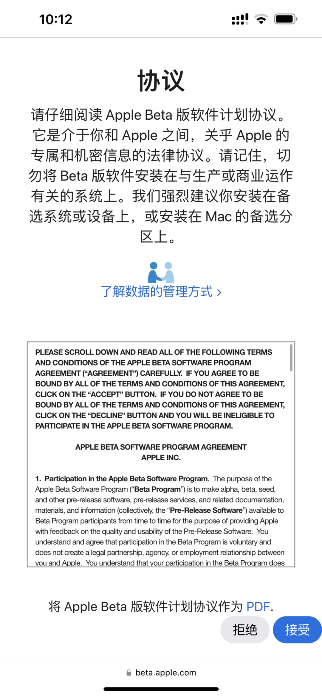 如果你需要升级 iPhone / iPad,请使用 iPhone / iPad 访问 Apple Beta 版软件计划页面并点击注册按钮,然后跟随引导完成注册,注册过程中你需要阅读《Apple Beta 版软件计划协议》,并在确认之后点击接受按钮。