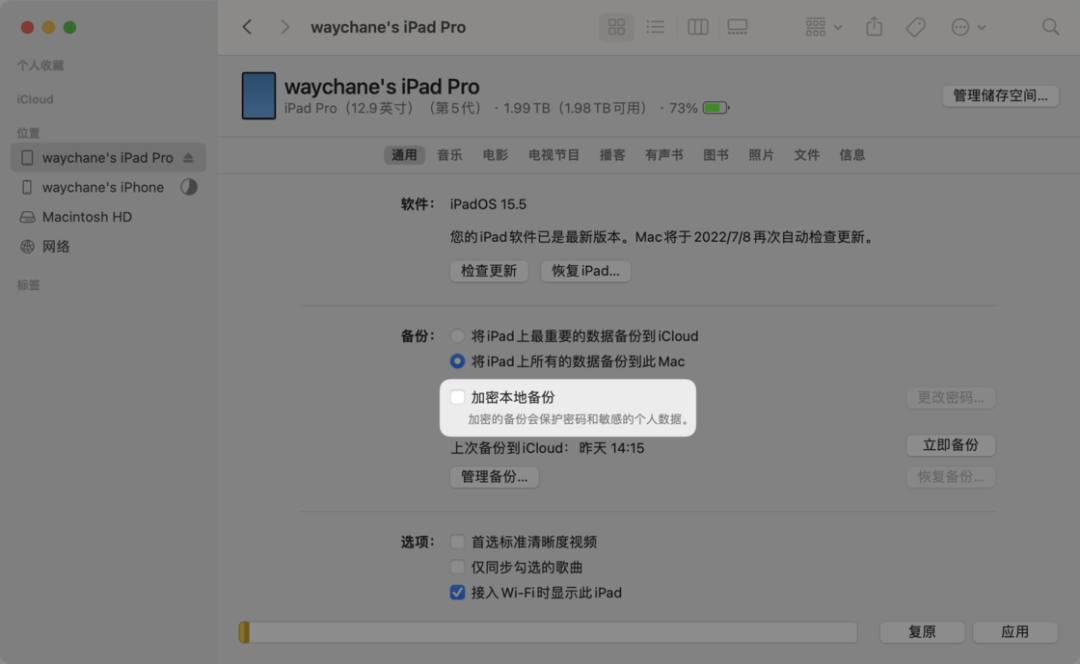 如果你的 iCloud 空间有限,还可以选择用 Mac 上的 Finder 或者 Windows 上的 iTunes,在电脑本地备份系统数据。为了保证数据传输的稳定性和效率,我们推荐你使用有线连接的方式连接电脑和手机、平板设备,而不要使用无线方式进行连接和备份。如果你希望备份账户密码、健康应用和 Homekit 中的数据,请勾选「加密本地备份」。之后选择立即备份,等待备份完成。