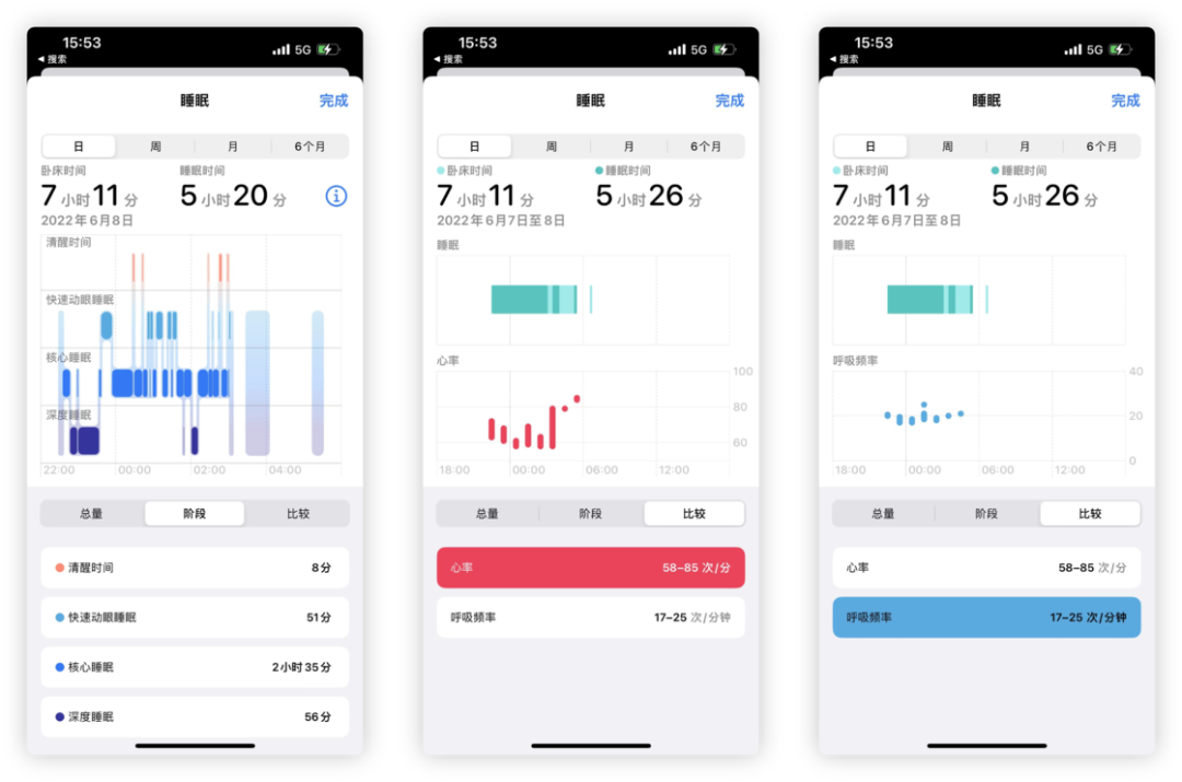 iOS 16 的健康 App 整体设计没有变化,主要追加了两项新的功能,分别是睡眠分析和用药提醒。新版本的睡眠分析不再只是总时长的统计,还加入了睡眠阶段的详细分析,包含清醒时间、快速动眼睡眠、核心睡眠、深度睡眠五个阶段。与此同时,还会记录睡眠期间的心率波动以及呼吸频率的数据信息。