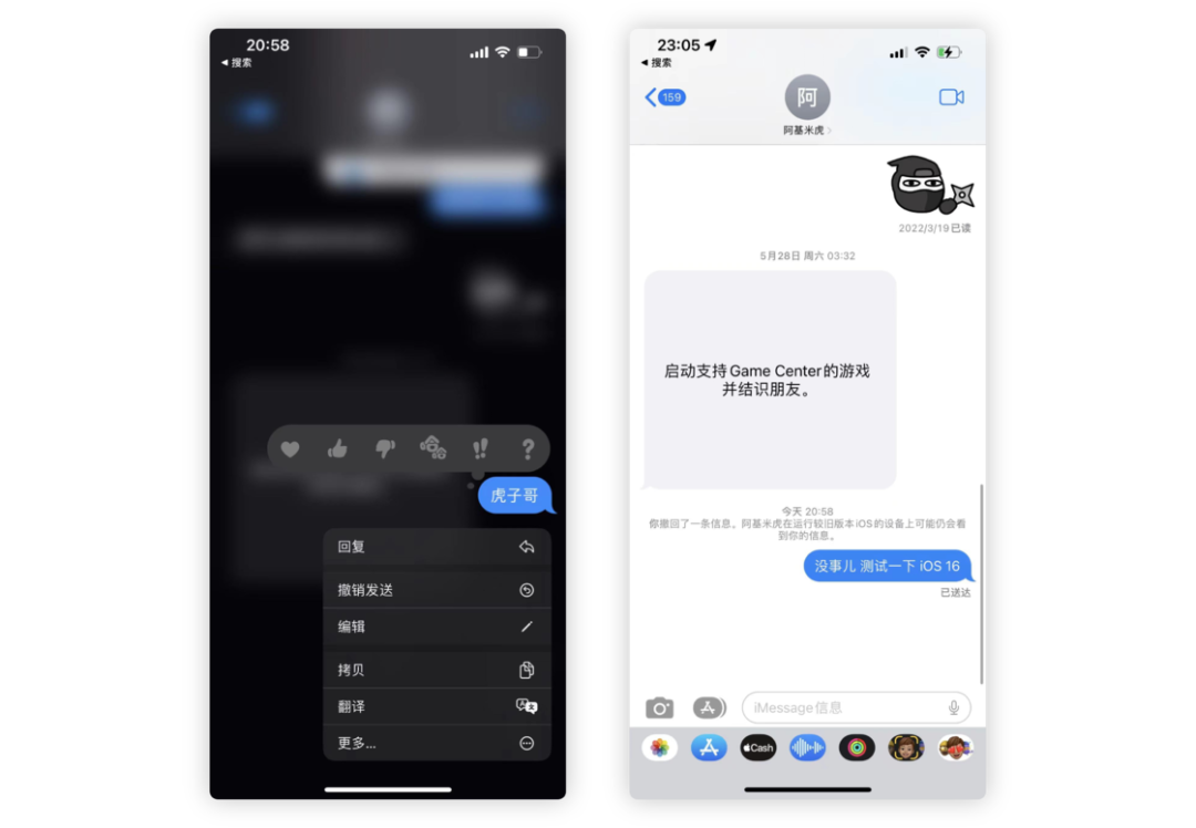 iMessage 作为原生的 Apple 即时通信 App,体验总体来说还是不错,但也存在很多小问题,比如发送的信息无法撤回修改等等。新版的 iOS 中,就解决了这个问题。用户在发送信息后的 15 分钟以内,可以长按信息进行撤回或者二次编辑,删除的信息也可以在 30 天内进行恢复。该功能需要交流的双方都处于 iOS 16 以及同代的 iPadOS 或 macOS 系统,如果对方系统过低该功能将无法使用。