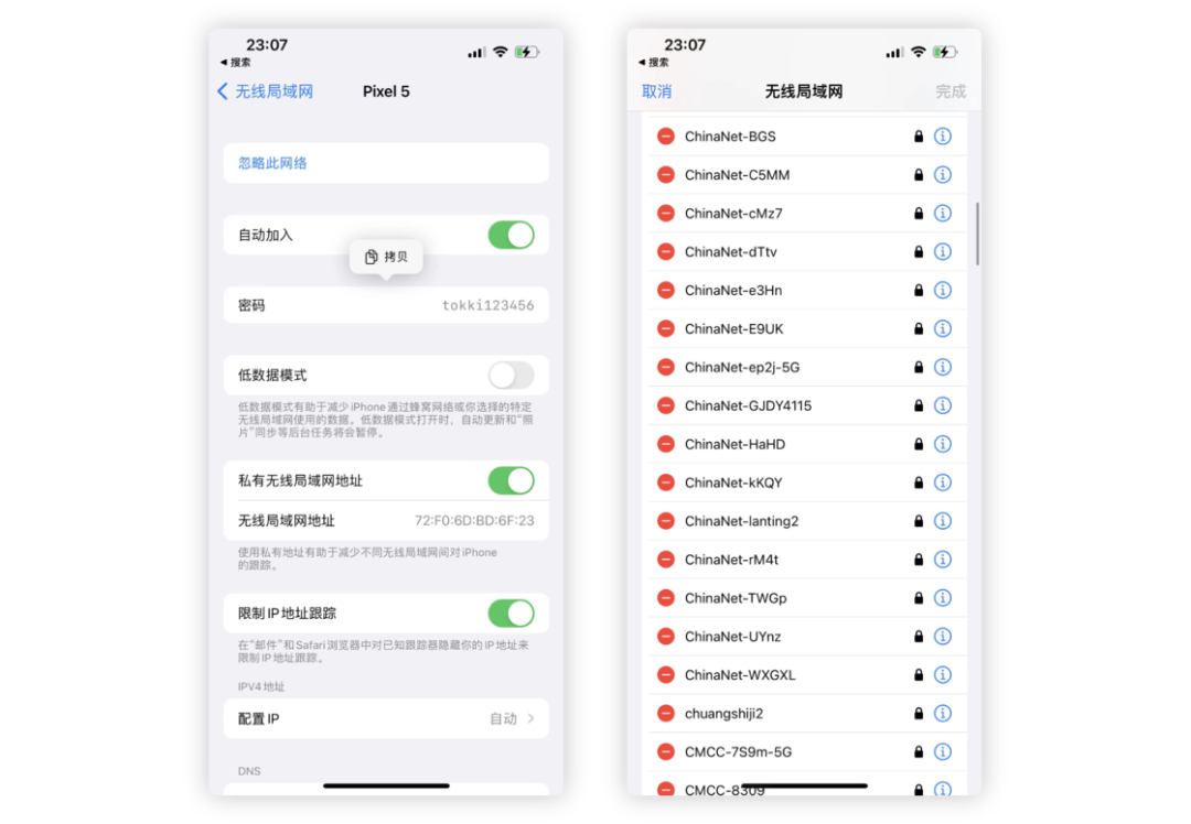 之前,iOS 并不支持 Wi-Fi 密码的查看,只可以快速将 Wi-Fi 共享给其他设备。目前,你可以进入无线局域网页面,点击目前连接的 Wi-Fi 信息,即可看到密码信息。此外,点击右上角的编辑按钮,还可以看到目前加入过的 Wi-Fi 列表,针对于不用的部分可以进行删除,并且也可以浏览历史的密码以及地址信息。