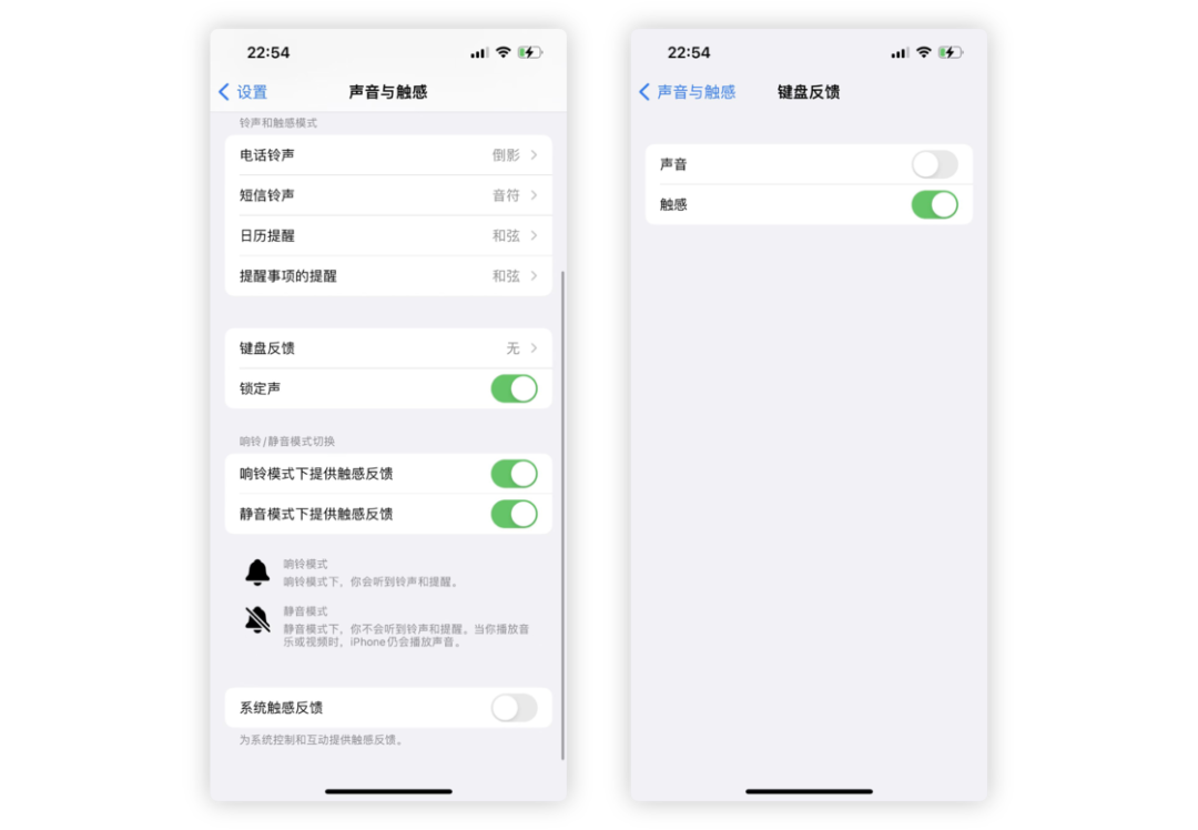 iOS 16 系统中加入全局性的触感反馈,不仅在进行系统控制和交互方面加入了轻微的触感反馈,还给键盘输入加入了触感的设定。目前,暂时只有开启和关闭的选项,不支持触感反馈的力度调整。