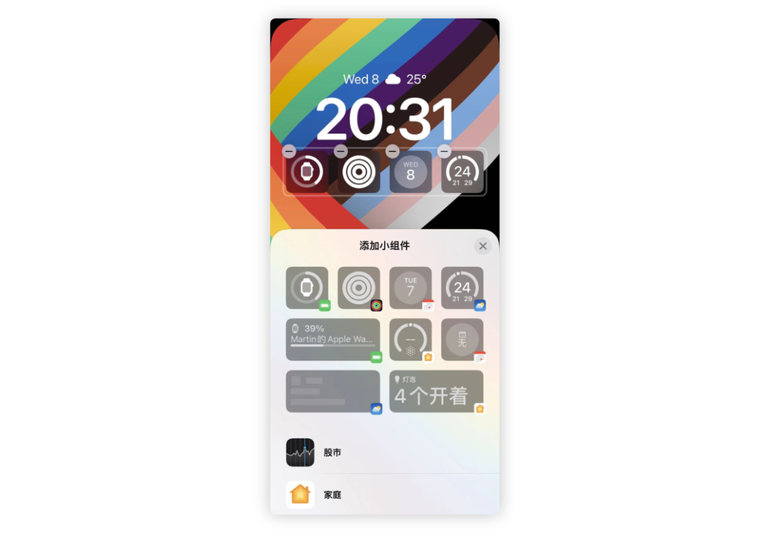 时间的下部区域是模块化的小组件区域,这个区域内的小组件包含了股市、家庭、健身、日历、时钟、提醒事项、天气、电池八个原生类目。和顶部小组件不同的是,这里的组件样式更加丰富,设计感更强,大小选择也更加多样化,你可以根据自己的喜好进行随意搭配。值得一提的是,锁屏的小组件 Apple 已将相关权限开放给开发者,如果 App 进行适配,后续将可以在锁屏中看到更多精彩的内容。