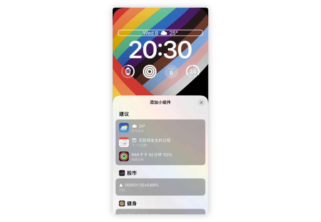 本次锁屏的变动主要围绕着个性化进行展开。时间的上下部分都被 Apple 定义为了小组件区域,上部以单行图标配文字的形式进行展现,你可以根据自己的需要选择日历、股市、健身、时钟、天气五个原生类目。