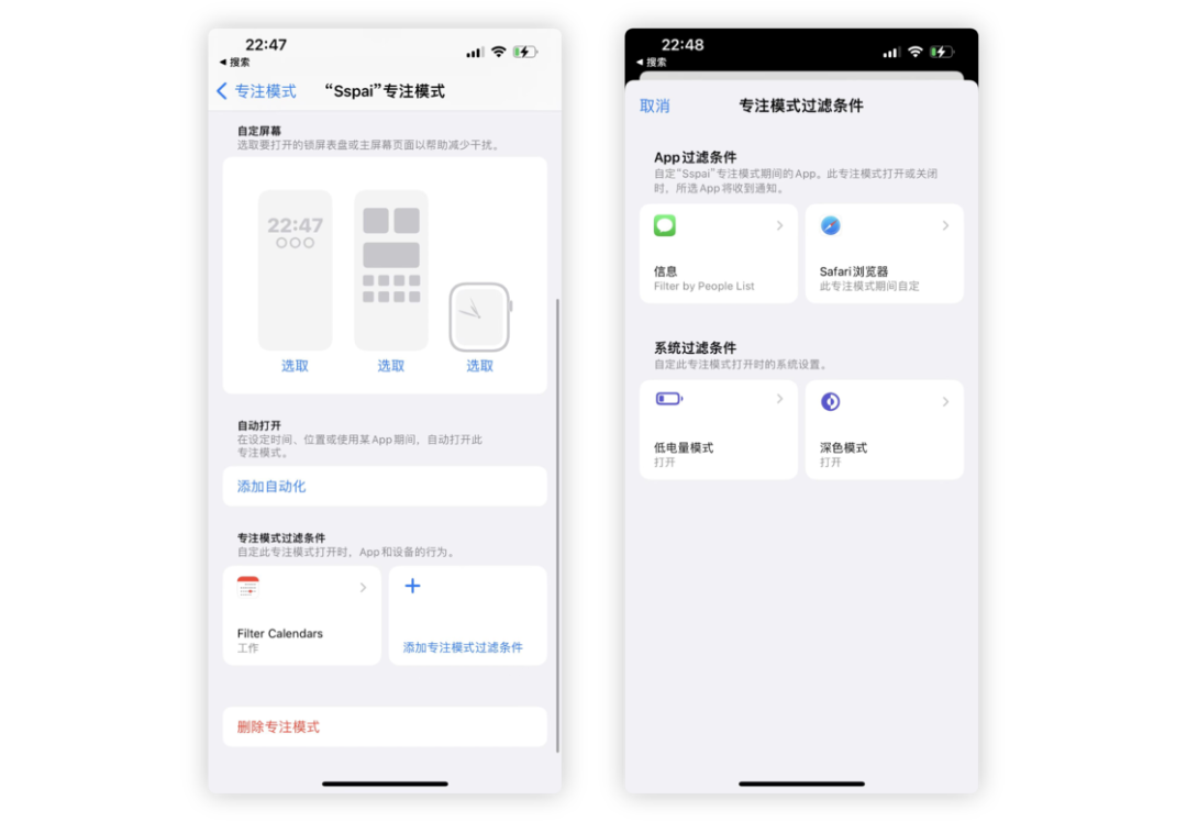 此外,这次 Apple 还提供了一项专注模式过滤条件。在这里你可以针对日历、信息、浏览器、低电量模式、深色模式进行更加细致的设定。例如,当相应的专注模式开启时,日历会会被筛选,其余的日历无法查看,系统会自动开启等等。这样一来,专注模式的功能变得更加自动化、更加个性化。相信在以后的更新中,专注模式应该可以做到更多的事情。