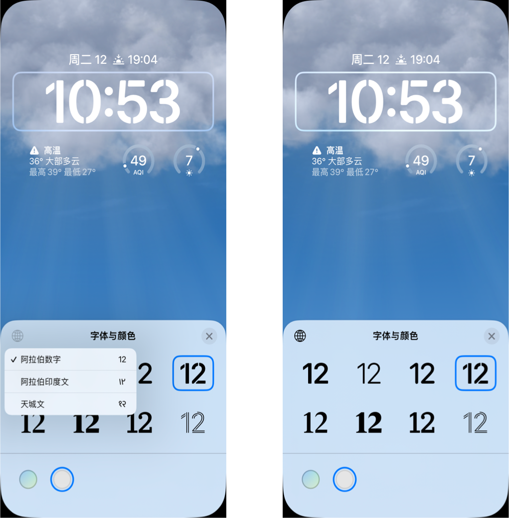 中间时间部分,Apple 不仅调整了占位大小,还提供了阿拉伯数字、阿拉伯印度文、天城文三种文字,每种文字包含了多种不同的设计。针对色彩部分,你可以在最下方选择背景适配色彩,也可以选择纯白色。