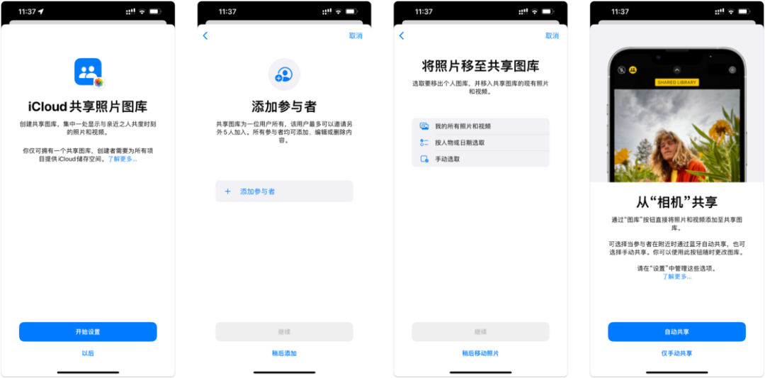 iOS 16 中,家庭共享图库将作为一个单独图库存在,你可以根据开始日期或照片中的人物,选取想要囊括的内容。共享图库设置完成后,你可以在相机 app 中直接共享照片,也可选择当共享图库的成员在附近时自动共享给对方,或是从「为你推荐」中获取智能建议,将照片添加到共享图库中。此外,在相机拍摄时如果选择共享模式,拍摄的照片将会直接共享给家人。
