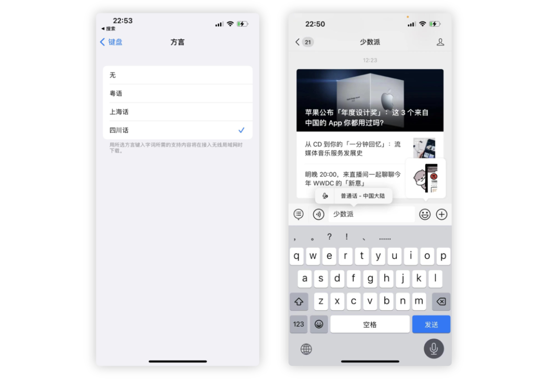 键盘方面,针对拼音输入追加了四川话的选项,可以通过「设置」>「通用」>「键盘」>「方言」进行查看。此外,手动输入和语音输入可以同时执行了。这样一来,即使说错了内容,也可以快速用键盘进行手动修改,无需来回切换输入模式。