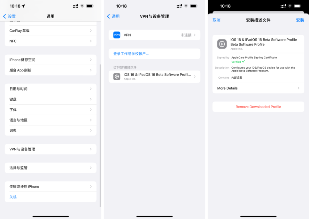在系统设置中找到「通用」>「VPN 与设备管理」选项中,选择刚刚下载的描述文件,点击「安装」,输入设备锁屏密码并同意安装协议,重启你的 iOS / iPadOS 设备。之后,你就可以在「设置」>「通用>「软件更新」中更新设备了。