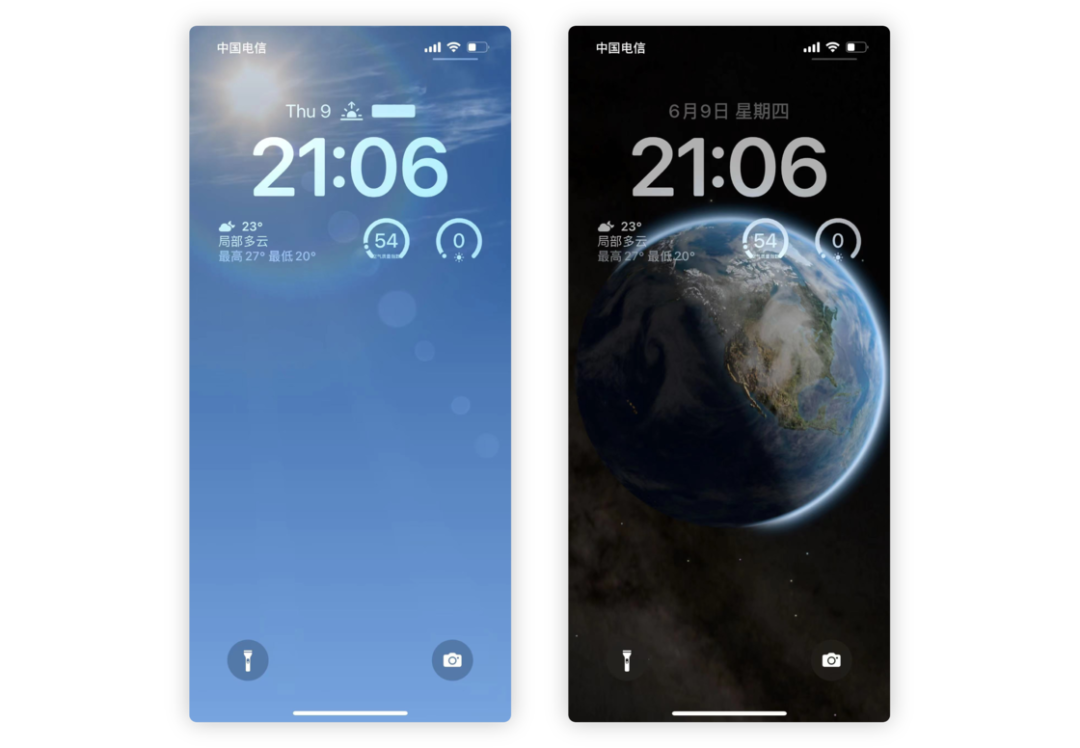 首先,日期文本迁移到了时间上方;其次,时间文本占位变大,更加醒目;再者,通知中心的信息采用了从下方开始往上堆叠的方式,中部留白区域更多。最后,中上部区域新增了小组件区域。