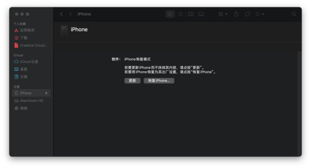 接下来,Finder 或 iTunes 会检测到你有一台处于恢复模式的设备,并询问你是否要恢复或更新设备。
