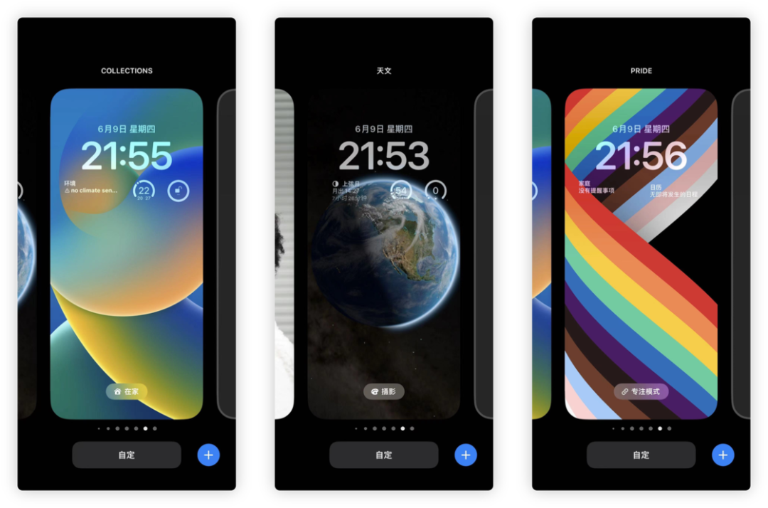 在 iOS 16 中,你可以将自己的锁屏以及桌面与专注模式进行关联,在开启不同专注模式的同时,锁屏和桌面会自动切换到自己先前设定的方案中。在不同的环境下你可能需要接受到信息不一样,例如在家需要看智能设备的状态,在工作的时候需要看日程计划,在摄影的时候需要关心日出日落。在小组件不同的同时,也可以换一张不同的壁纸,换个壁纸也换一个心情。