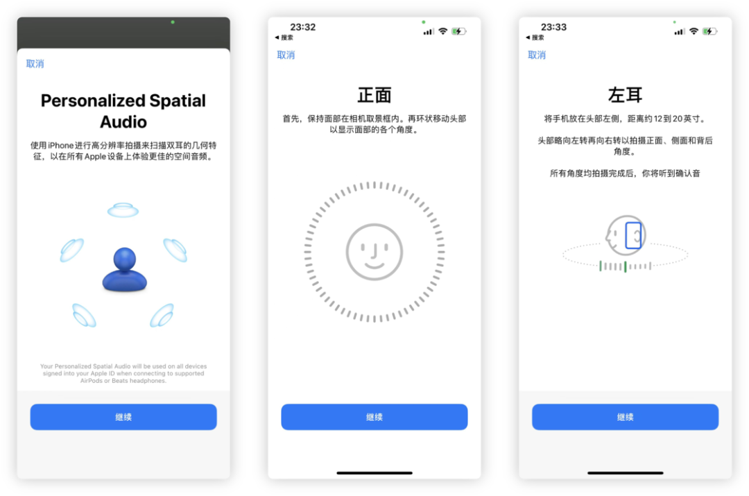 iOS 16 中,Apple 再一次优化了空间音频的体验。当你首次设置 AirPods 系列产品时,系统会自动提示将为你定制个性化的空间音频,然后会通过 Face ID 对你的面部以及左右耳进行扫描,在系统中生产属于你专属的几何特征,然后对空间音频进行个性化的适配。(个人觉得目前没有听出太大的区别)