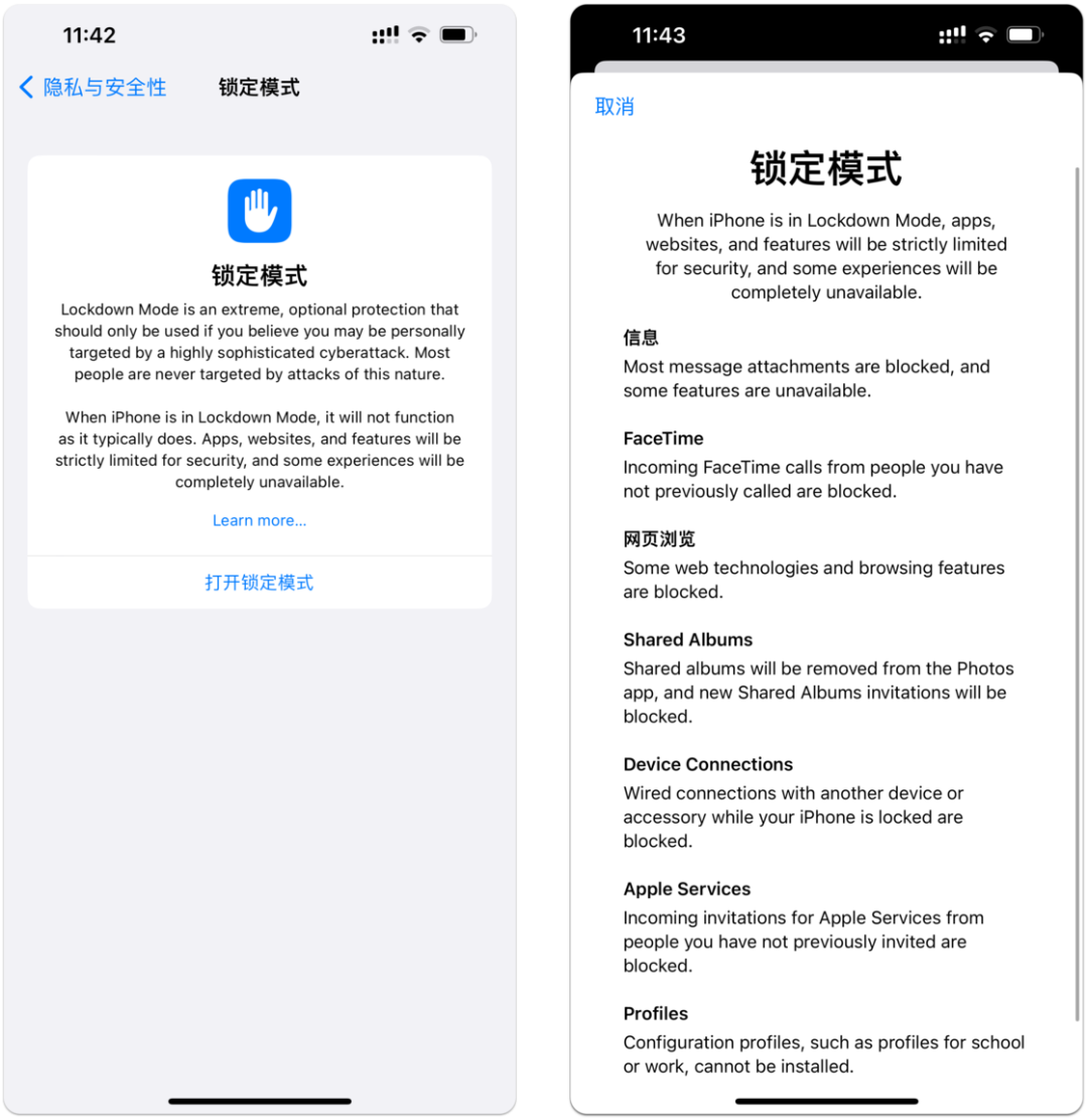 顾名思义,锁定模式可以帮助用户严格限制设备的操作和网络访问,以应对网络攻击的风险。具体来说,开启该模式后短信内的链接和附件无法加载和预览、部分网页元素会屏蔽、无法和未通过验证的用户进行 FaceTime 通话等。不过需要注意的是,锁定模式主要针对极端的网络攻击情形,一般情况下无需启用,否则会影响到 iPhone 的正常使用。