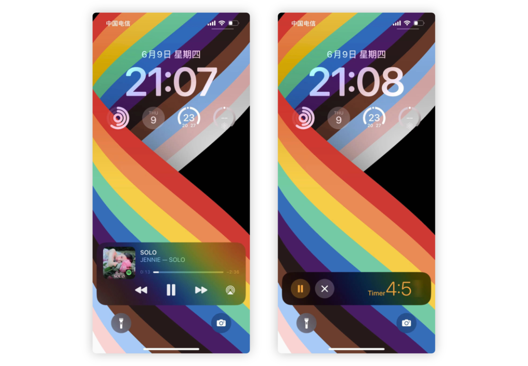 此外,锁屏的通知还加入实时活动,这样一来你就可以更快地在锁屏了解到一些正在发生的事情,比如外卖、比赛、健身等等。目前暂时只有倒计时和部分音乐 App 支持实时活动显示,其余的第三方暂未支持,Apple 表示相关 API 将在今年晚些时候对开发者开放。