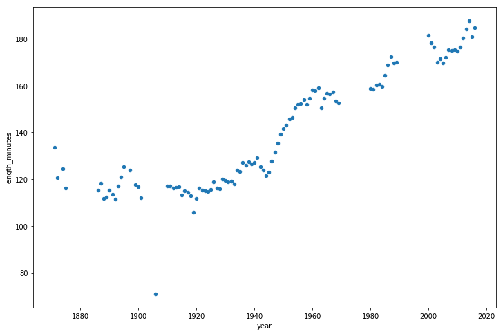 game_lengths.reset_index().plot.scatter('year','length_minutes')