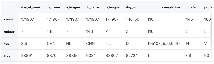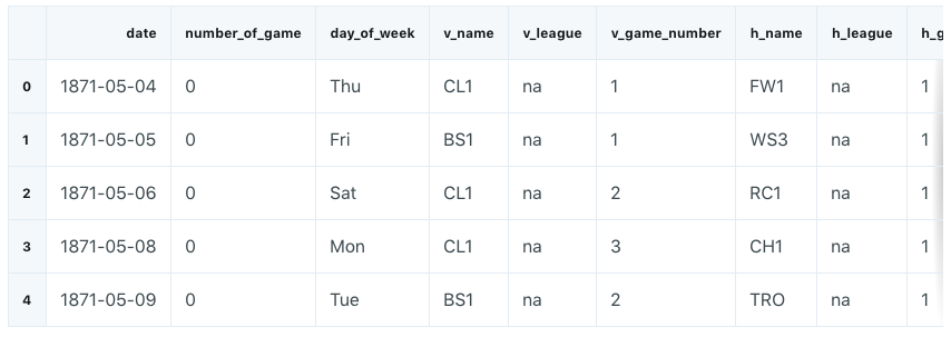 下面我们总结了一些重要的列,但如果你想了解所有的列,我们也为整个数据集创建了一个数据词典:https://data.world/dataquest/mlb-game-logs/workspace/data-dictionary。