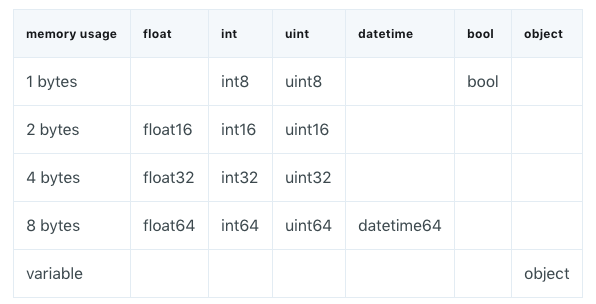 pandas 中的许多类型都有多个子类型,这些子类型可以使用更少的字节来表示每个值。比如说 float 类型就包含 float16、float32 和 float64 子类型。类型名称中的数字就代表该类型表示值的位(bit)数。比如说,我们刚刚列出的子类型就分别使用了 2、4、8、16 个字节。下面的表格给出了 pandas 中最常用类型的子类型: