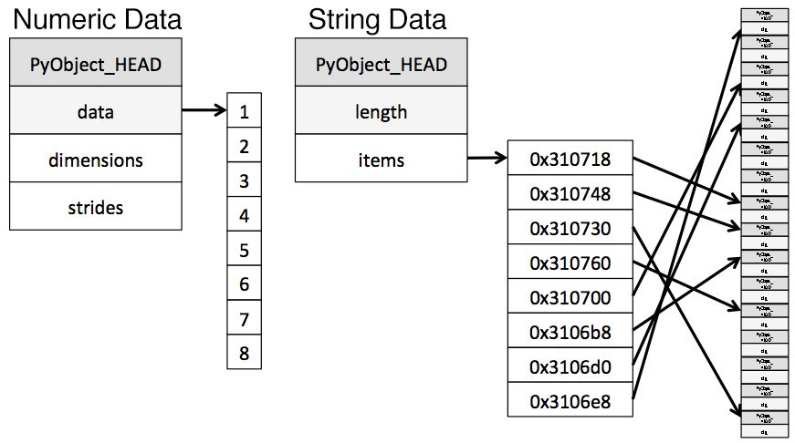 在 pandas.core.internals 模块中,每一种类型都有一个专门的类。pandas 使用 ObjectBlock 类来表示包含字符串列的块,用 FloatBlock 类表示包含浮点数列的块。对于表示整型数和浮点数这些数值的块,pandas 会将这些列组合起来,存储成 NumPy ndarray。NumPy ndarray 是围绕 C 语言的数组构建的,其中的值存储在内存的连续块中。这种存储方案使得对值的访问速度非常快。
