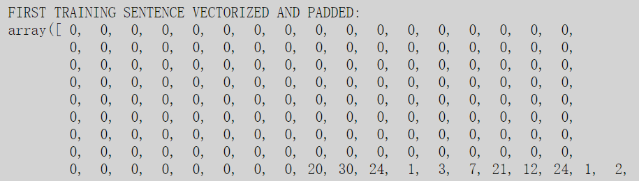 如图所示,除了最后(它的句子比最长的句子要短得多)有值之外,其他都是零。这些非零数字代表句子的不同单词的索引:20是表示单词Mary的索引,30表示移动,24表示,1表示,3表示浴室,依此类推。实际的句子是: