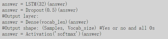 最后,添加模型的其余层,添加LSTM层(而不是文中的RNN),dropout层和最终的softmax来计算输出。