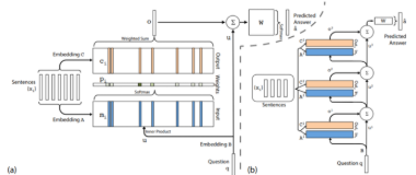 在上图的左侧部分,我们可以看到该模型的单层的表示。针对每个句子计算两个不同的嵌入A和C。此外,查询或问题q使用B来嵌入表示。