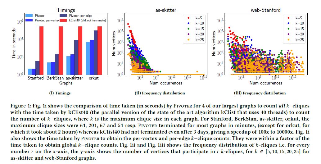 摘要:集团计数是网络分析的基本任务,甚至 3个 -cliques(三角形)最简单的设置是最近许多研究的中心。获得ķ -cliques的数量较大ķ算法是具有挑战性的,由于大派系的搜索空间的指数爆破。但最近的一些应用程序(特别是对社区检测或群集)的使用更大的集团计数。此外,一个经常希望 textit 本地计数的k个 -cliques每顶点/边的数量。我们的主要结果是Pivoter,算法恰好计数的ķ -cliques数 textit对中的k 的所有值。这是在实践中出人意料地有效,并且能够得到的是超出以前的工作的覆盖面图的集团计数。例如,Pivoter获取社会网络的所有集团计数与商品机器的两个小时内一个100M的边。上一页并行算法不终止日。Pivoter也能切实得到当地每顶点和每边ķ -clique计数(所有ķ)的许多公共数据集的数以千万计的边。据我们所知,这是第一个算法,实现了这样的结果。主要见解是一个简洁的派树(SCT),其存储在输入图中的所有派系压缩唯一表示的结构。它使用一种被称为 textit 转动,由勒布朗 - Kerbosch经典的方法,以减少回溯算法的最大派系的递归树建。值得注意的是,SCT可在不实际枚举所有派系来构建,并提供从它的确切集团统计(ķ -clique计数,计数地方),可以有效地读出一个简洁的数据结构。