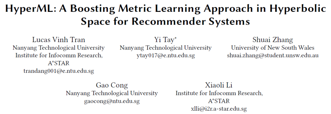 研究了非欧氏空间中学习用户和项目表示的概念。具体来说,我们通过探索Mobius回转向量空间来研究双曲空间中的度量学习与协作滤波之间的关系,该空间的形式可以用来推广最常见的欧氏向量运算。总的来说,这项工作旨在通过度量学习的方法来弥补推荐系统中欧几里德几何和双曲几何之间的差距。我们提出了HyperML(双曲度量学习),这是一个概念简单但效率很高的模型,可以提高性能。通过一系列广泛的实验,我们证明了我们提出的HyperML不仅优于欧几里德模型,而且在多个基准数据集上达到了最新的性能,证明了个性化推荐在双曲几何中的有效性。