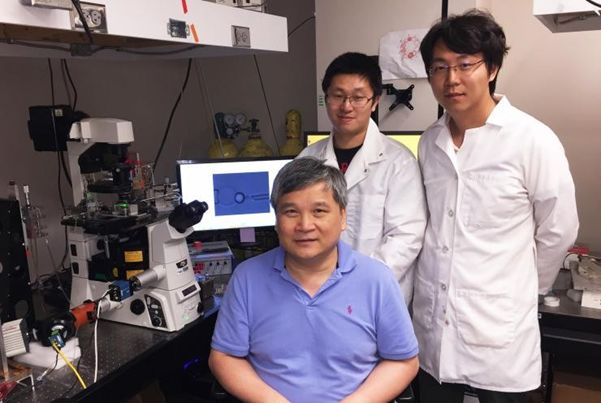 图2 在本工作中推广了第二代生物膜测力仪(照片左侧)的三人照片:居理宁(后左一)、陈昀峰(后右一)、朱承(前排)。在本工作中,生物膜测力仪是研究血小板如何在止血过程中感应机械力刺激的主要技术手段。