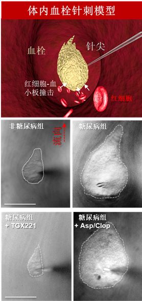 · 通过开展小鼠体内血栓模型实验,证实了糖尿病会引起尚未活化的血小板在血管中的聚合,其过程所倚赖的是一种生物力学机制。正常治疗剂量的阿司匹林、氯吡格雷均不能对这种生物力学机制产生抑制作用,但是如果抑制磷脂酰肌醇3-激酶则可以对其产生有效的阻断(图1)。