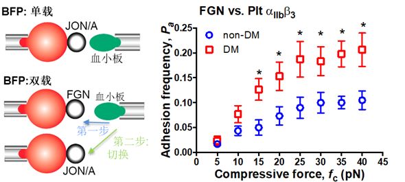这项工作开发了一系列原创性实验手段,包括:1)体内针刺血栓模型,该实验手段证实了在糖尿病小鼠的体内,血流冲刷力确实能提升血小板形成血栓的能力(图1);2)单分子生物膜力学探针(BFP),运用该技术手段我们发现,血小板通过表面表达的整合素进行的细胞黏附,其强度在一定挤压力下会受到激发,得到显著提升,但是如果机械压力低于某一阈值则无法激发(图3);3)体外流动腔实验,运用该技术研究者发现血液中的红细胞能提高血小板的黏附能力,但对于糖尿病血小板的黏附能力增幅的作用更为显著。