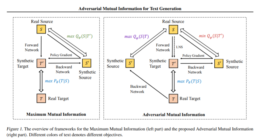 在最大化源与目标之间的互信息方面的最新进展已经证明了它在文本生成方面的有效性。然而,以往的工作对MI(即MI)的后向网络建模关注较少。这对于变分信息最大化下界的紧密性至关重要。在本文中,我们提出了一个对抗互信息(AMI):一个文本生成框架,它是一个新的鞍点(min-max)优化,旨在识别源与目标之间的联合交互。在这个框架中,通过比较真实和合成的数据分布,前向网络和后向网络能够迭代地提升或降级彼此生成的实例。我们还开发了一个潜在噪声采样策略,利用高级语义空间的随机变化来增强生成过程中的长期依赖性。基于不同文本生成任务的大量实验表明,所提出的AMI框架能够显著优于多个强基线,我们还表明,AMI有可能为变分信息最大化问题带来更紧密的互信息上限。